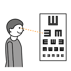Piirroshahmo katsoo näöntarkistustaulun E-kirjainta.