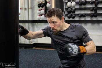Mies lyö nyrkkeilysäkkiä kuntosalilla.