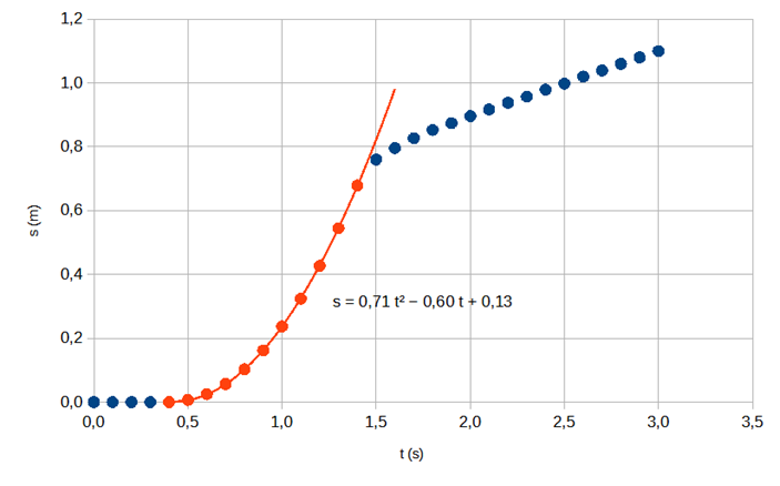 Motivering: Mätpunkterna för grafen s(t) i intervallet 0,4–1,4 s faller mycket exakt på en parabel som är anpassad till punkterna. Det här antyder att rörelsen i det här tidsintervallet är likformigt accelererad inom gränserna för mätnoggrannheten. Mätpunkten som finns vid tiden 1,5 sekunder faller inte på kurvan, alltså har accelerationen ändrat mellan 1,4–1,5 s. Det här beror på att kulan träffat vattnet.