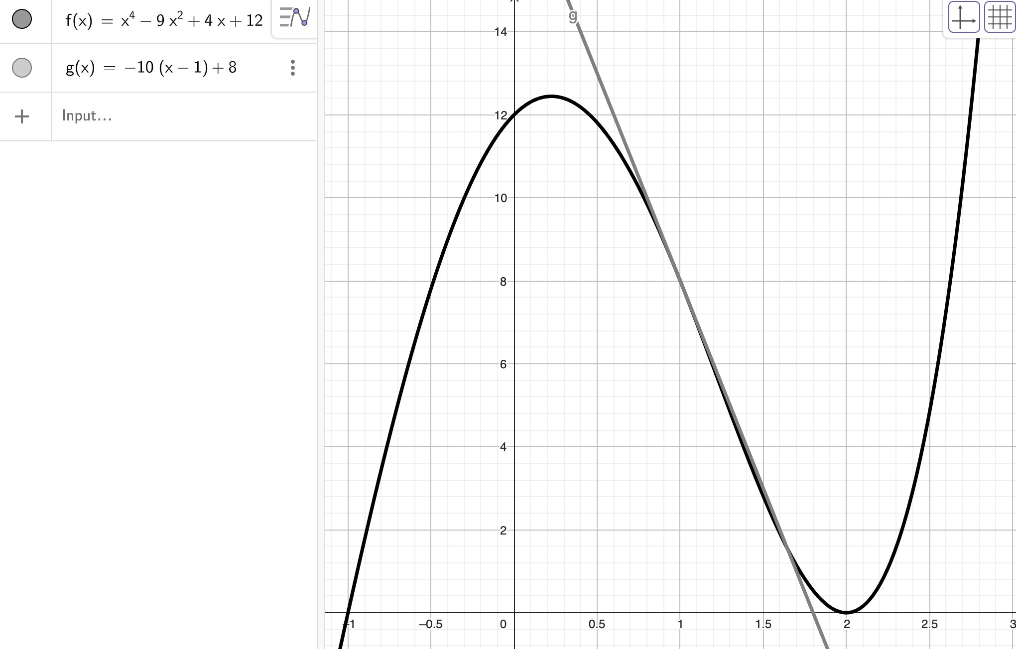 (Esimerkki perustelusta: Koska f'(1) =-10 ja f(1) =8, on tangentin yhtälö y -8 =-10 (x -1) TAI Komento ja oikea tangentin yhtälö näkyvissä.) (1 p.)