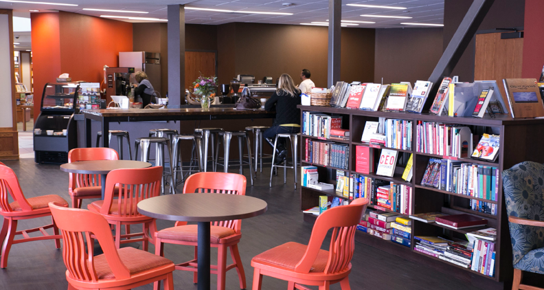 I förgrunden en bokhylla och två grupper med bord och stolar, i bakgrunden en restaurangdisk