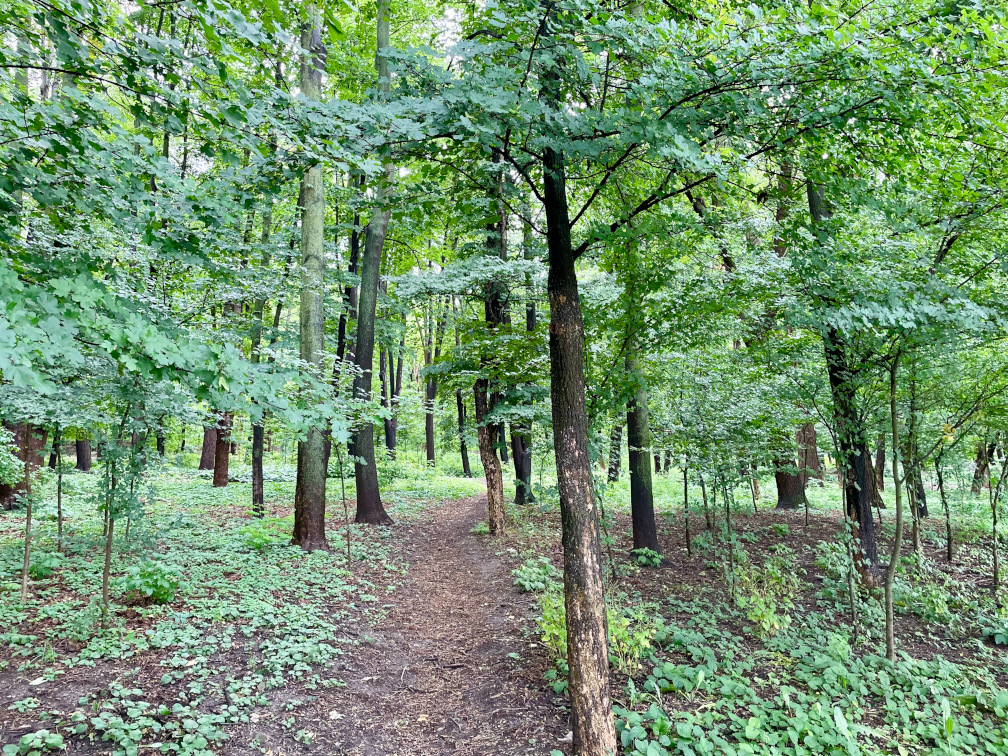 På bilden syns en centraleuropeisk lövskog där det löper en stig. På bilden syns inga människor.