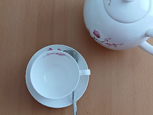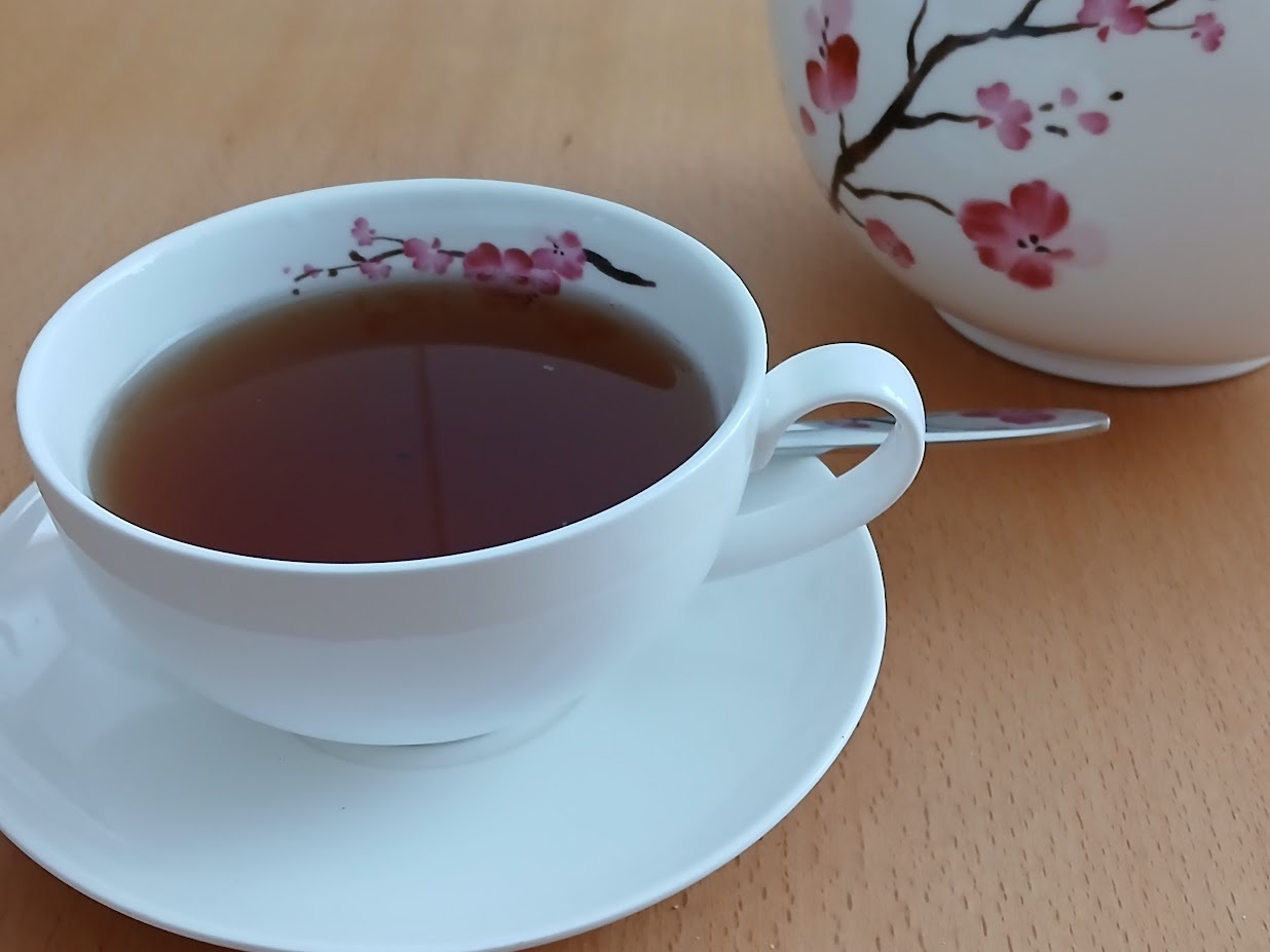 Tekoppen är full med te. Skeden ligger på fatet bakom tekoppen.